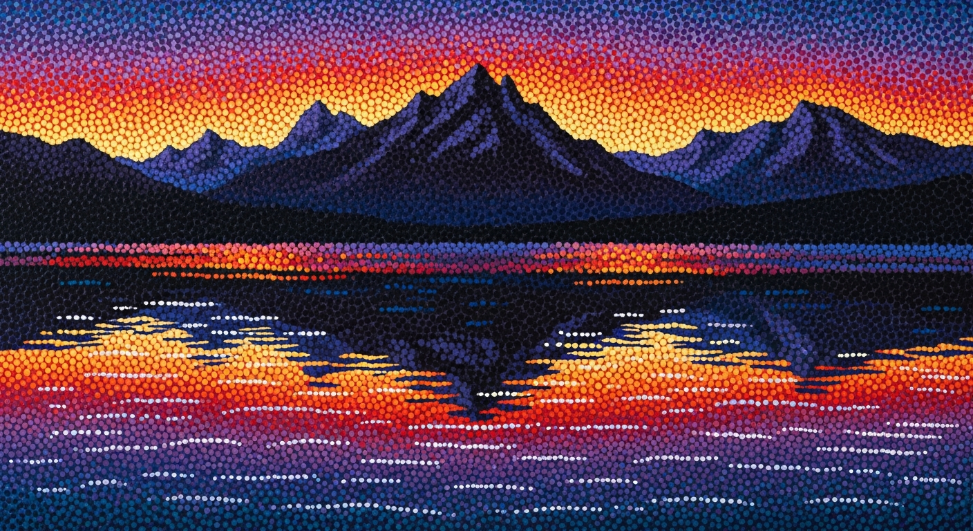 advanced pointillism painting of a serene lake at sunset